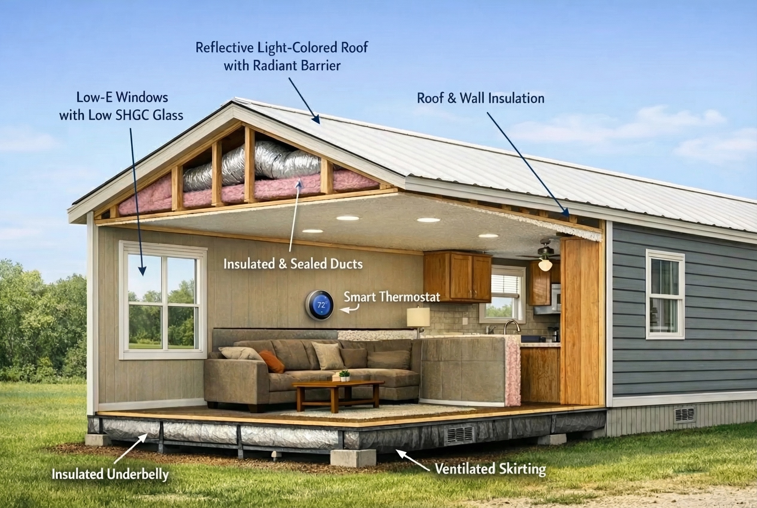 An energy efficient manufactured home for San Antonio is the product of a few smart decisions that work together. Start with a tight, well insulated building shell, choose low solar gain windows and a reflective roof color, and pair them with a right sized, high efficiency HVAC system and sealed ducts. Add smart controls and thoughtful site placement, and you can expect a cooler, drier, more comfortable home that costs less to operate through the long Texas summer.